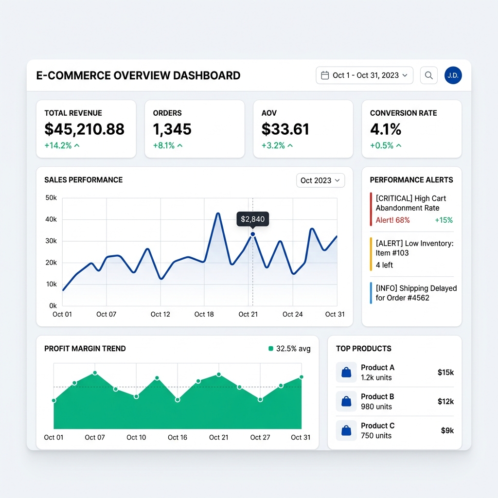 Biến dữ liệu thô thành dashboard thực tiễn, giúp nhìn rõ hiệu suất và phát hiện cảnh báo sớm.